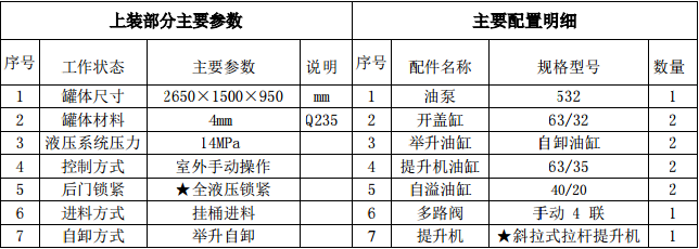 上裝配置:罐體采用優(yōu)質(zhì)碳鋼板材,罐體內(nèi)部帶固液分離功能(全推推板,不銹鋼泔水分離網(wǎng)板),罐內(nèi)加熱功能(用于嚴(yán)寒地帶防止罐內(nèi)餐飲垃圾凍結(jié)凝固,采用柴油燃燒機(jī)加熱,加熱速度快效果好,可設(shè)置高低溫實(shí)現(xiàn)自動溫控)全液壓操作系統(tǒng),工作人員操作方便,罐體舉升自卸,拉桿式掛桶提升機(jī),可以掛120/240升垃圾桶進(jìn)行作業(yè),后蓋液壓驅(qū)動開啟、鎖緊,方便人員操作。