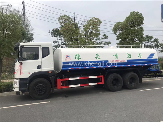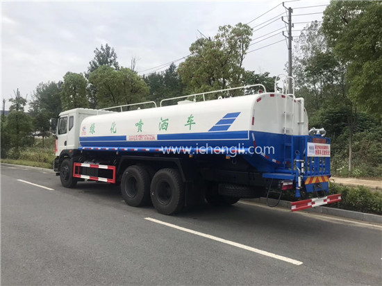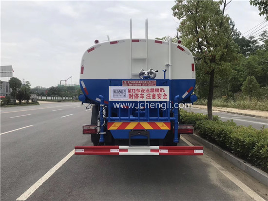 根據(jù)客戶要求:罐體容積約20立方;專(zhuān)用功能為:前沖后灑,帶側(cè)噴,帶高位花灑,罐體后帶工作平臺(tái),平臺(tái)上安裝綠化灑水高炮,灑水炮可全方位旋轉(zhuǎn),并有多種雨?duì)羁烧{(diào)節(jié)(大雨、中雨、毛毛雨、霧狀),泵可自吸自排,帶自流閥,帶消防接頭,帶過(guò)濾裝置。