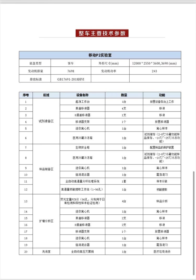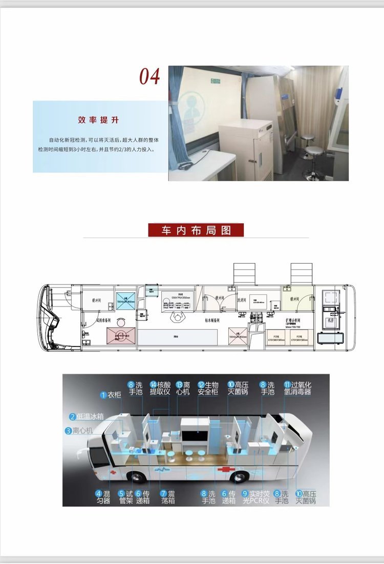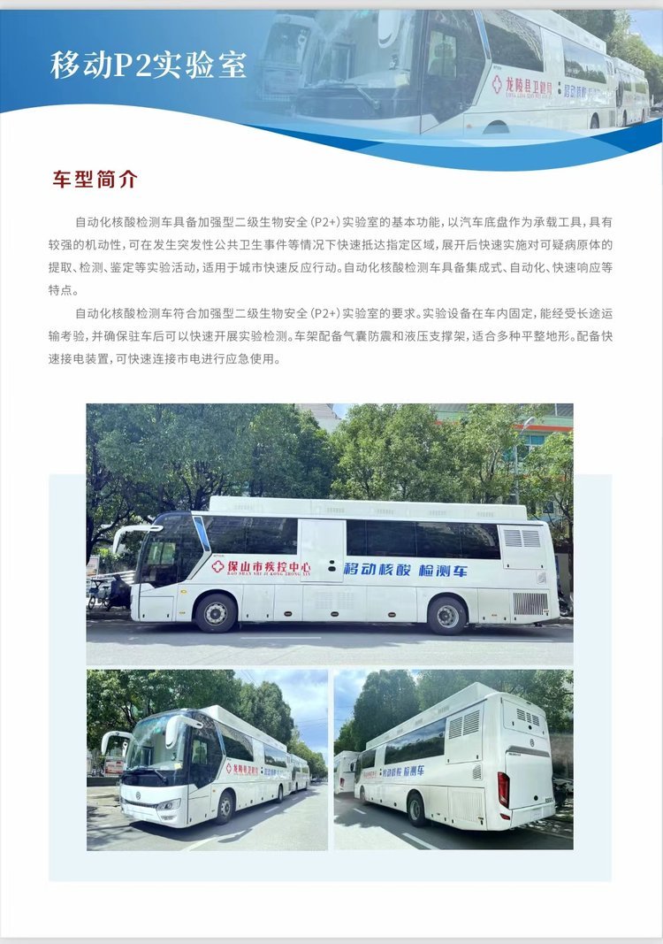 移動(dòng)核酸P2自動(dòng)化檢測(cè)車,自動(dòng)化核酸檢測(cè)車具備加強(qiáng)型二級(jí)生物安排(P2+)實(shí)驗(yàn)室基本功能,以汽車底盤作為承載工具,具有較強(qiáng)的機(jī)動(dòng)性,可在發(fā)生突發(fā)性公共衛(wèi)生事件等情況下快速抵達(dá)指定區(qū)域,展開后快速實(shí)施對(duì)可疑病原體的提取、檢測(cè)、鑒定等試驗(yàn)活動(dòng)。