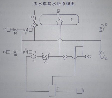 1、取力器 2、水泵 3、水罐 4、連通閥 5、消防球閥 6、過(guò)濾網(wǎng) 7、前沖閥 8、灑水炮閥 9、側(cè)噴閥 10、后灑閥 11、灑水炮 12、罐口蓋 13、前沖器 14、側(cè)噴蓮花頭 15、后灑砣 16、防旋板 ABC、三通四位閥