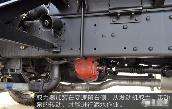 取力器加裝在變速箱右側(cè),從發(fā)動機(jī)取力,帶動泵的轉(zhuǎn)動,才能進(jìn)行灑水作業(yè)。