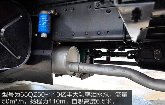 東風(fēng)145灑水車選用型號為65QZ50-110億豐大功率灑水泵,流量50m³/h,揚(yáng)程為110m,自吸高度6.5米。灑水泵緊鄰排氣管,該車為國四排放,符合國家規(guī)定的排放標(biāo)準(zhǔn)。