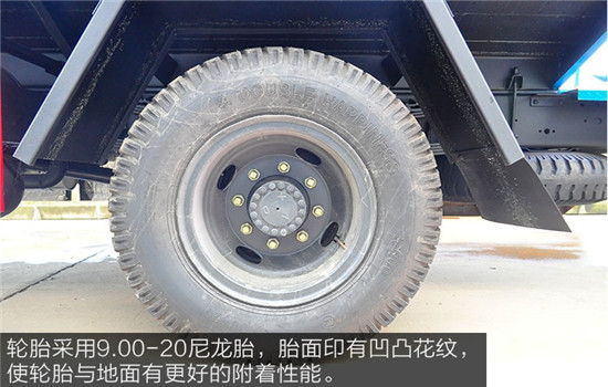 輪胎采用9.00-20尼龍?zhí)?,胎面印有凹凸花紋,使輪胎與地面有更好的附著性能,防止縱、橫向滑移,增加抓地力。