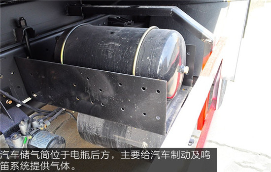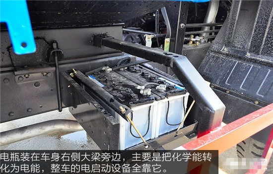 電瓶裝在車身右側(cè)大梁旁邊,主要是把化學(xué)能轉(zhuǎn)化為電能,整車的電啟動設(shè)備全靠它。