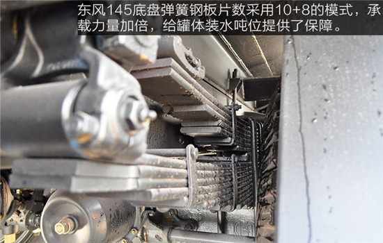 彈簧片決定了車身的承載力量,東風(fēng)145底盤彈簧鋼板片數(shù)采用10+8的模式,承載力量加倍,給罐體裝水噸位提供了保障。