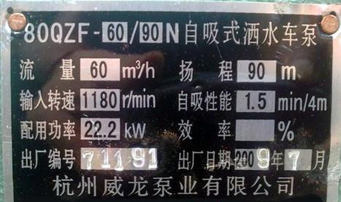 客戶朋友可以參考了以上信息來(lái)確定自己的灑水車(chē)水泵型號(hào),一般灑水車(chē)水泵上可以找到一個(gè)類(lèi)似下面的灑水車(chē)銘牌。