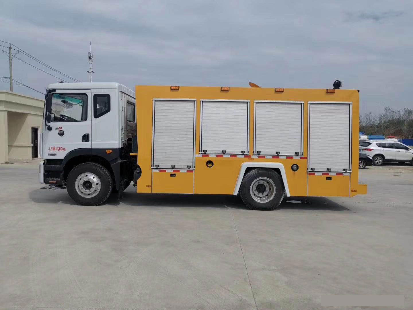 東風(fēng)多利卡D9工程黃牌搶險(xiǎn)救援車,本實(shí)用新型的有益效果:綜合性、一體化程度高,結(jié)構(gòu)布置科學(xué)合理。車廂尾部可選擇安裝2T徐工折臂吊,滿足救援現(xiàn)場(chǎng)設(shè)備和重物吊裝,一車多用。結(jié)構(gòu)布局合理,現(xiàn)代科技感強(qiáng),實(shí)用性高??刹僮餍詮?qiáng),封閉部分可根據(jù)車載的設(shè)備的尺寸和不同的用途進(jìn)行分配。廂體為特殊材質(zhì),可運(yùn)輸、防雨、防火、阻燃、防塵、防銹、降燥,隔震、長(zhǎng)期抗震。配備移動(dòng)氧源,空氣呼吸器等,在礦山、石油與化工,化工品毒氣泄漏中科發(fā)揮巨大作用。氣防車本身可以用發(fā)動(dòng)機(jī)發(fā)電,在發(fā)動(dòng)機(jī)異常不能發(fā)電時(shí),還可以用市政供電來為照明燈給出電力。因?yàn)榭紤]到搶險(xiǎn)救援車的要求,所以將左右側(cè)窗改為盲窗結(jié)構(gòu)。