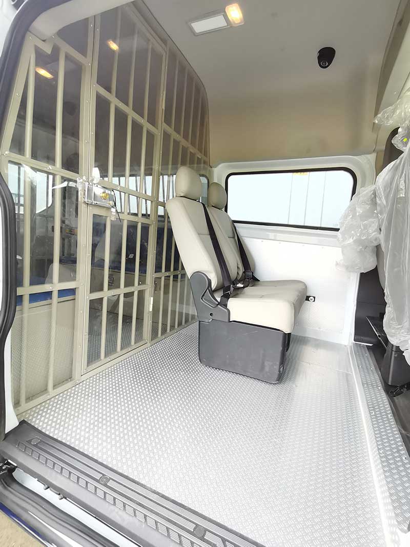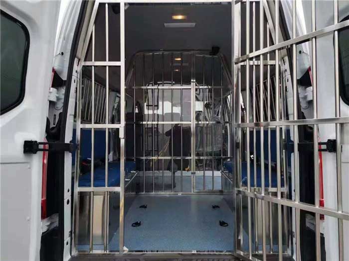 警用囚車_福特新全順V362囚車,后艙囚籠。為相關(guān)部門的安全工作給出非常有力的確保。系統(tǒng)應(yīng)用攝像機能對車內(nèi)辦公區(qū)、車身周邊、囚室區(qū)進行全方位監(jiān)控。車上設(shè)備可對攝像資料進行實時顯示、存貯。整車涂裝,耐腐蝕性強。通過配備的無線車載終端與總部指揮中心進行及時數(shù)據(jù)傳送和在線指令傳達,更加的人性化與智能化。