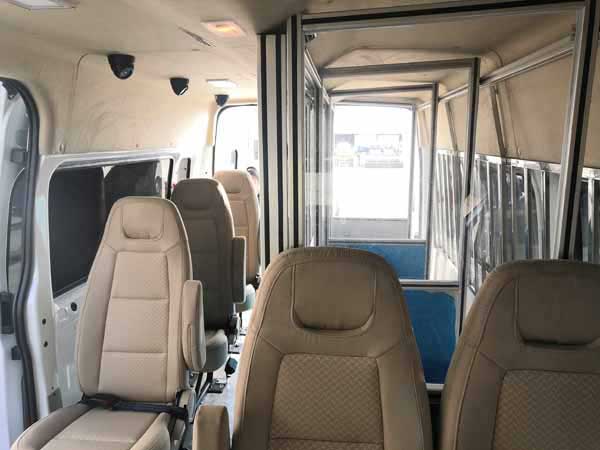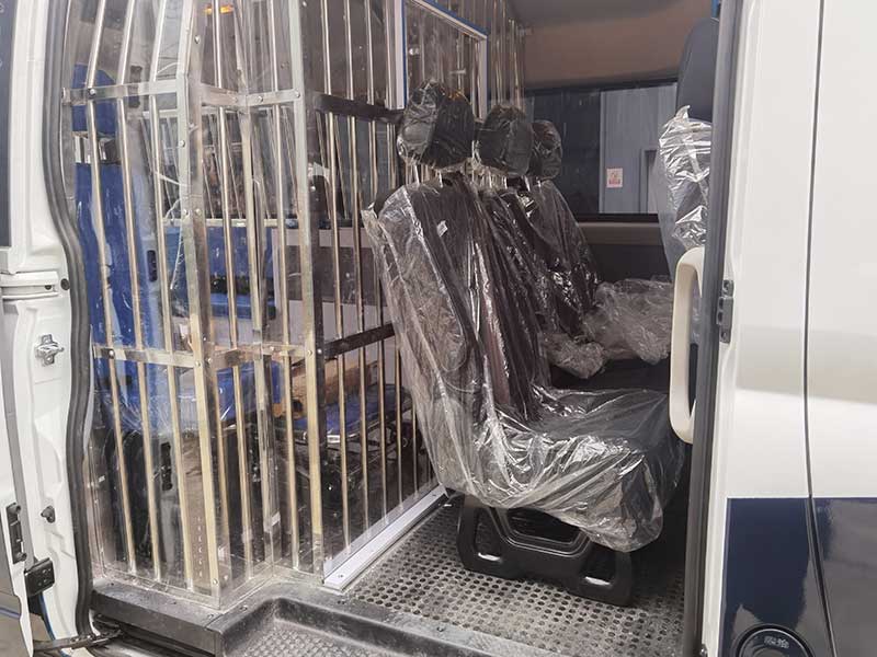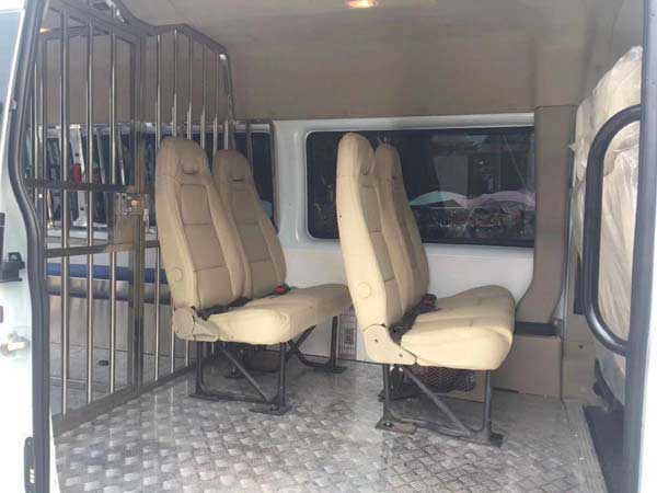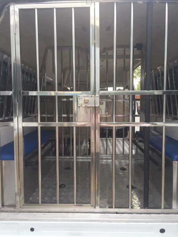 大通V80囚車,押解艙內(nèi)不得有尖銳凸起物。內(nèi)部可加裝等離子殺菌凈化系統(tǒng),防止病毒傳染,設(shè)計(jì)特別人性化??蓪?shí)現(xiàn)5G網(wǎng)絡(luò)實(shí)時定位,使嫌疑人和警員的安全得到充份的確保,更加安全實(shí)用。右側(cè)為3個單獨(dú)的警員坐椅,左側(cè)為3個獨(dú)立的不銹鋼囚籠。每個坐椅都有安全防護(hù)措施,腳鐐固定環(huán)和安全帶,配置先進(jìn),工藝精細(xì)。