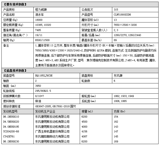 底盤配置:采用東風D9系列新款駕駛室,3950mm軸距,搭載國六(國Ⅵ)玉柴200馬力柴油發(fā)動機/康明斯210匹馬力柴油發(fā)動機,6檔變速箱,9T后橋,295真空胎,方向助力、斷氣剎、電動窗、中控鎖、ABS,原裝空調(diào),GB7258新規(guī)。