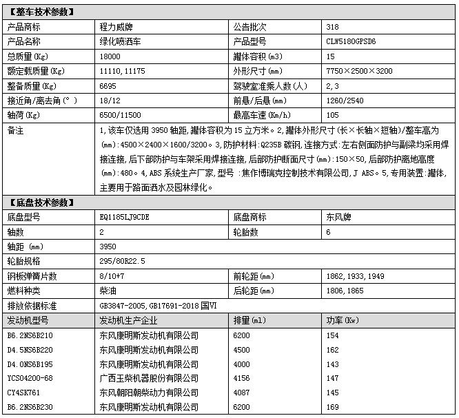 底盤配置:采用東風D9系列新款駕駛室,3950mm軸距,搭載國六(國Ⅵ)玉柴200馬力柴油發(fā)動機/康明斯210匹馬力柴油發(fā)動機,6檔變速箱,9T后橋,295真空胎,方向助力、斷氣剎、電動窗、中控鎖、ABS,原裝空調(diào),GB7258新規(guī)。