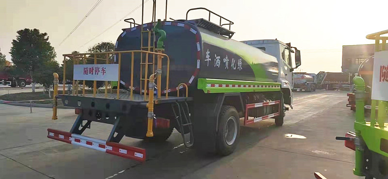 前沖(噴)、后灑、帶側(cè)噴(花灑)、帶后工作平臺、平臺上安裝綠化灑水高炮(炮噴射形狀可調(diào)節(jié):直沖、大雨、中雨、毛毛雨、霧狀、可連續(xù)調(diào)節(jié),360°旋轉(zhuǎn)),配消防接口,自流閥,濾網(wǎng),帶自吸自排功能。
