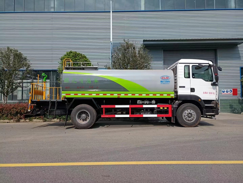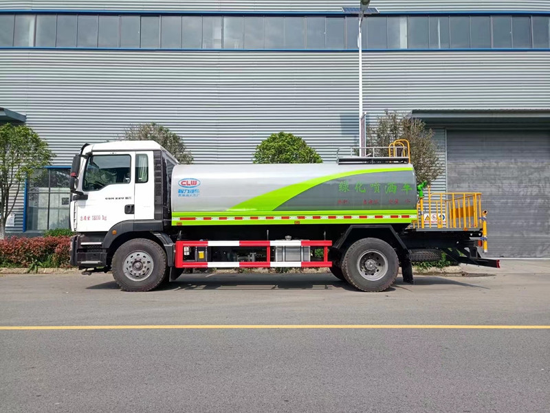 重汽汕德卡灑水車,G5M駕駛室,容積:12立方,濰柴220馬力發(fā)動機,軸距4500mm,重汽八檔變速箱,4.5T前橋,9T后橋,250大梁,10.00R20鋼絲胎,方向助力,斷氣剎,自動空調(diào),氣囊座椅,電動玻璃,中控鎖,遙控鑰匙,多功能方向盤,電動調(diào)節(jié)帶加熱后視鏡;其他標配。罐體容積:12立方,整車螺栓鉚接,大口徑直通球閥,鋁合金三通,罐體材質(zhì)采用4mm碳鋼Q235材質(zhì)一次成型,大功率專用灑水泵,高轉(zhuǎn)速取力器,整車前沖、后灑、側(cè)噴、高位花灑,后平臺帶綠化灑水高炮,可調(diào)節(jié)直沖狀,大雨、小雨、毛毛雨、霧狀;后平臺可選裝30米、40米、50米全自動柴油霧炮機,可有效清除霧霾,降塵,環(huán)境空氣等。