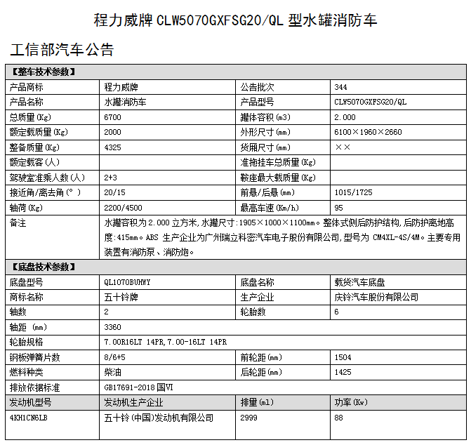 慶鈴五十鈴2噸水罐消防車,整車型號(hào):CLW5070GXFSG20/QL型水罐消防車,采用慶鈴五十鈴QL1070BUHWY原裝底盤改裝而成水罐消防車。整車由消防員乘員室和車身兩大部分組成,乘員室為原裝雙排,可乘坐2+3人,該車為內(nèi)藏罐結(jié)構(gòu),車身兩側(cè)為器材箱,中部為水罐,后部為泵房。載液罐體為優(yōu)質(zhì)碳鋼,與底盤采用彈性連接,載水2000kg,裝備CB10/20型低壓消防泵,額定流量20L/S,車頂安裝PS20型車用消防炮。該車輛結(jié)構(gòu)緊湊,配置完備,機(jī)動(dòng)性強(qiáng),能夠及時(shí)應(yīng)對(duì)企業(yè),社區(qū)或重點(diǎn)消防單位的火情,可以第一時(shí)間形成小型戰(zhàn)斗力進(jìn)行初期火災(zāi)的撲救和人員疏散撤離;可廣泛應(yīng)用于消防救援站,政府專職消防隊(duì),企業(yè)專職消防隊(duì)等。可選上牌種類(民用/軍用)手續(xù)。