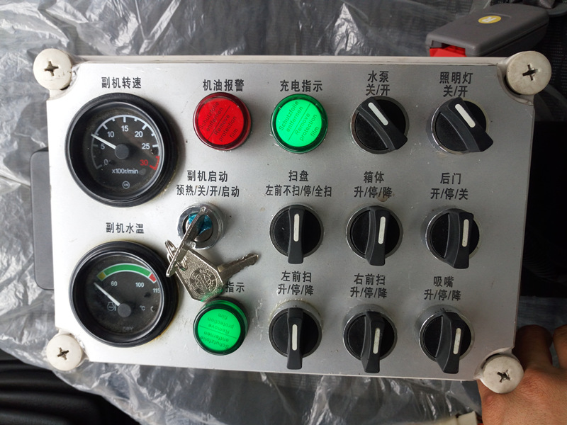 通過(guò)駕駛室內(nèi)的控制面板就可方便地操作副發(fā)動(dòng)機(jī)啟動(dòng)和熄火、風(fēng)機(jī)轉(zhuǎn)速升降、吸塵口升降、后門(mén)開(kāi)關(guān)、箱體升降等。