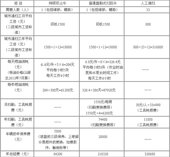 按建設(shè)部有關(guān)規(guī)定:人工清掃定額600平方米/小時,本吸塵車最大清掃能力為58,000平方米/小時,考慮路面污染程度及清掃速度不同,以平均20,000平方米/小時計,相當(dāng)于33個清掃工的工作量。按每年工作300天,每天工作6小時計算,本吸塵車清掃與普通掃路車清掃,人工清掃費用對比估算如下: