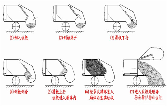 壓縮式垃圾車裝滿垃圾后垃圾箱完全處于封閉狀態(tài),在轉運途中不會污染環(huán)境。垃圾車在處理(或填埋)場卸出垃圾時,先舉起填裝器,敞開垃圾箱后端,原停于垃圾箱前端的推鏟向后移動,沿水平方向,把垃圾箱里的垃圾推出。垃圾卸料見圖一中步驟。