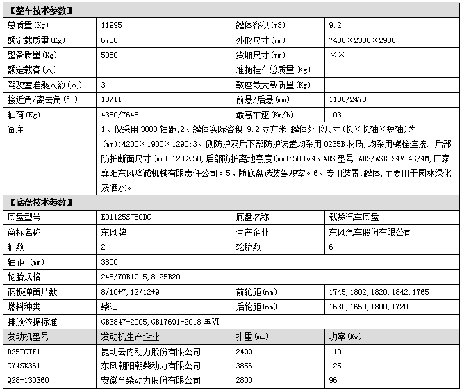 上裝配置:罐體容積:9.2立方,罐體鋼板采用Q235碳鋼鋼材,前沖后灑、側(cè)噴、平臺高炮、自流閥及消防接頭各1個、水管2根、標配大功率專用億豐泵或金龍泵,后平臺加裝30米、40米霧炮機組;其他標配。