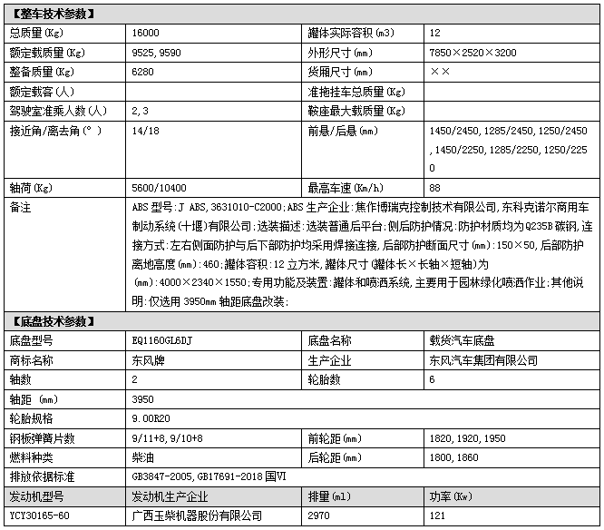 配置一:東風華神F5系列駕駛室,3950mm軸距,玉柴165馬力(YCY30165-60)發(fā)動機,國六排放,8檔變速箱,9.00R20鋼絲胎,原裝空調(diào),電動窗,ABS,氣剎,方向助力;