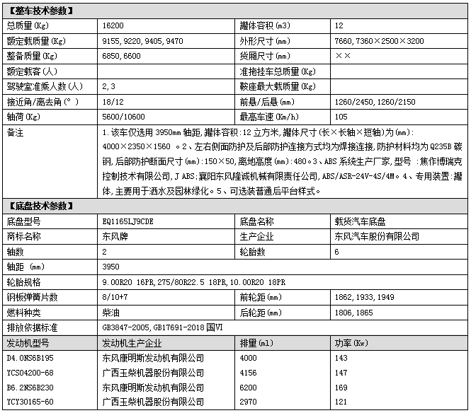 配置一:東風(fēng)D9多利卡系列駕駛室,3950mm軸距,玉柴165馬力(YCY30165-60)發(fā)動(dòng)機(jī),國六排放,陜齒8檔變速箱,9.00R20鋼絲胎,原裝空調(diào),電動(dòng)窗,ABS,氣剎,方向助力;